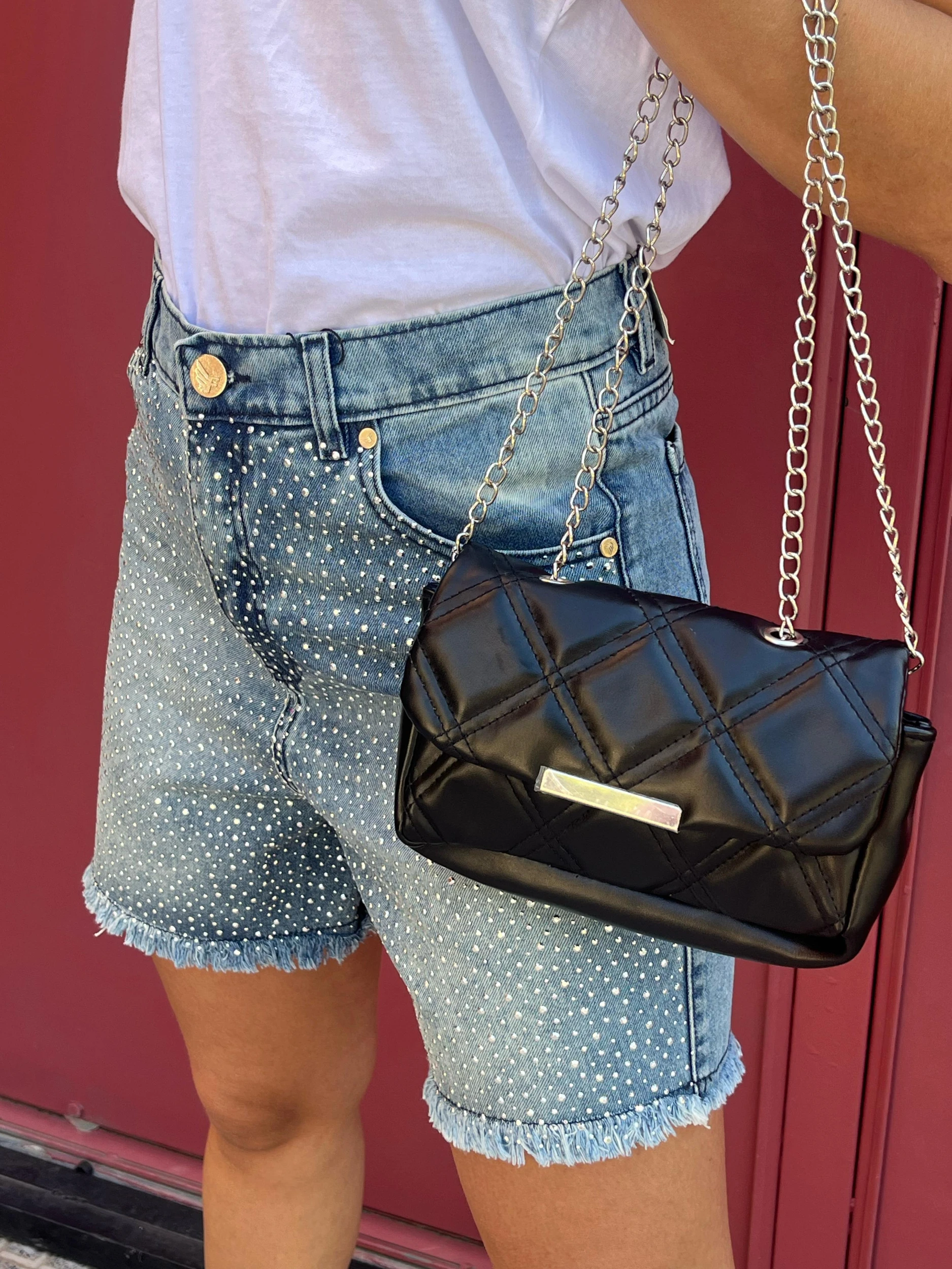Bermuda Luisana con Hotfix . Fresca, comoda con un brillo que llama la atencion. Perfecta ara un look relajado y divertido para la noche, parque o fiesta.