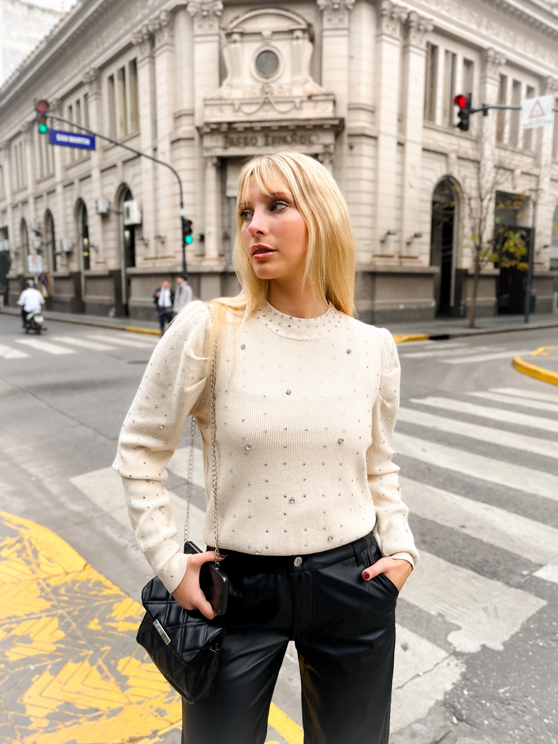 Sweater de Bremen 50% viscosa ,28% poliéster, 22% nailon, manga princesa, cuello alto rib.Acabados en rib. Detalle de hotfix y strass en el frente