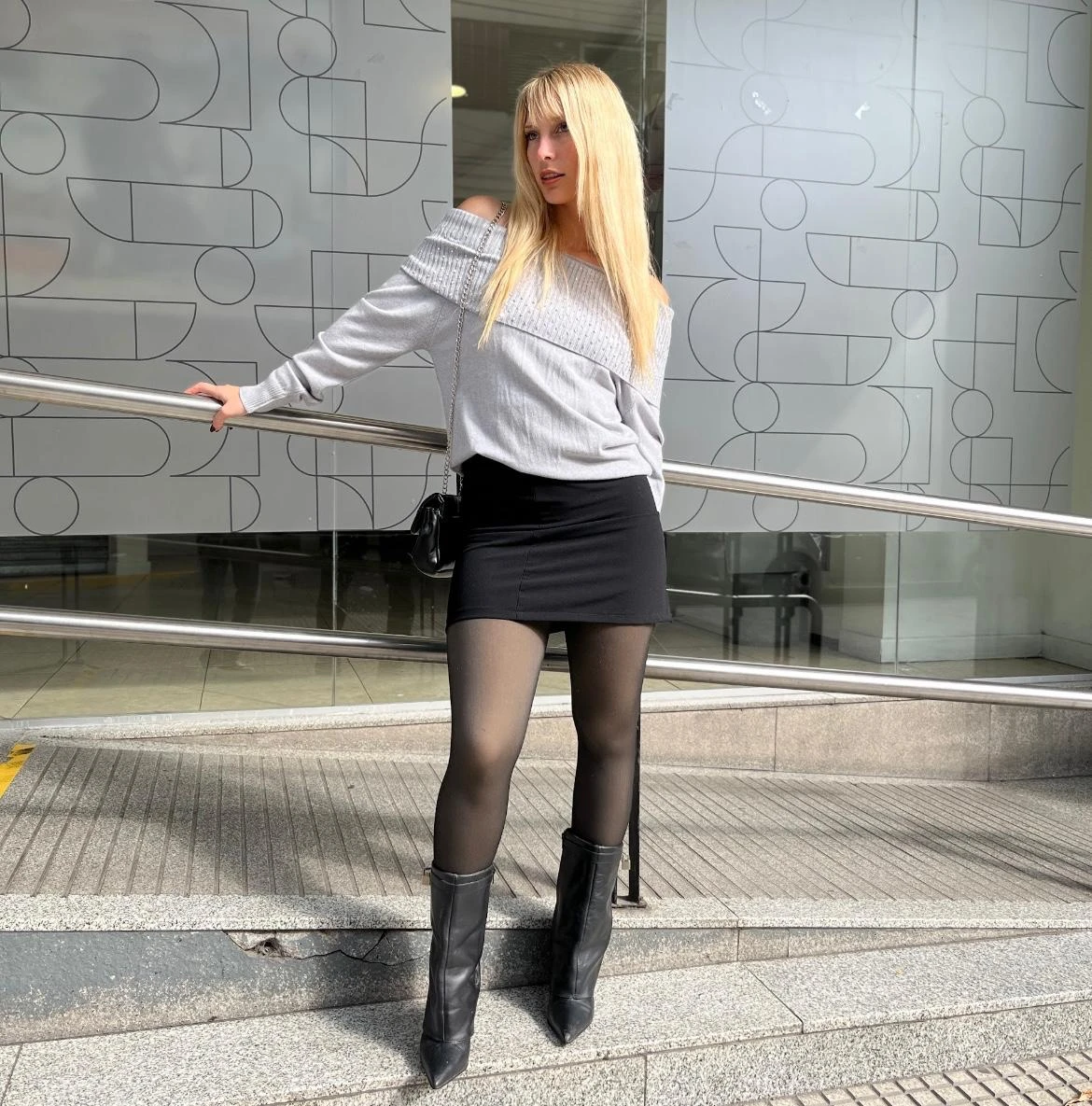 Sweater gris strapless con strass en el frente